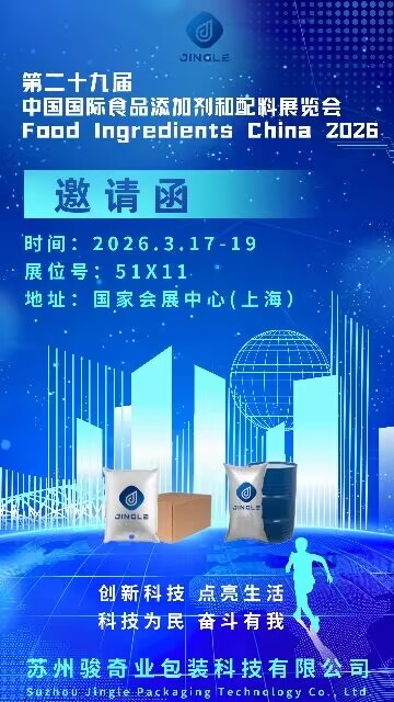 소주 징글 포장 기술 유한 회사 다가오는 행사에 참여하게 된 것을 기쁘게 생각합니다. 식품성분중국 2026 전시회. 이벤트는 다음부터 진행됩니다. 2026년 3월 17일~19일 에 국립전시컨벤션센터(상하이) . 방문객들은 회사의 전문가 팀을 만날 수 있습니다. 부스 51X11 포괄적인 패키징 솔루션을 탐색하고 잠재적인 협력에 대해 논의합니다.